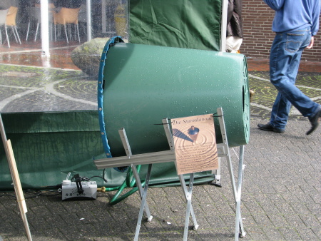 Die Sturmkanone ist eine umgebaute Wassertonne. Die große Öffnung ist mit einem festen Stoff bezogen, in der Unterseite ist ein, etwa handgroßes Loch. Schlägst du auf den Stoff, wird die in der Tonne befindliche Luft, ruckartig aus der Tonne gepresst. Den kleinen Sturm kannst du erleben, wenn du dich vor die Tonne stellst. Wird die Nebelmaschine mit eingeschaltet, wird der Sturm sichtbar und als Rauchring ausgestoßen. |