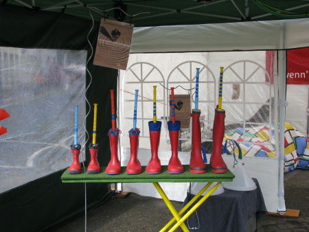 Um die Gummistiefelorgel zu spielen, drücke einfach auf die Gummistiefel und die Blockflöten machen Musik. Die Gummistiefel sind mit einem Stück Holz verschlossen, in dem ein Loch ist. In diesem Loch stecken die Blockflöten. Drückst du auf die Stiefel, kann die Luft nur durch die Blockflöte entweichen. So entsteht ein Ton. Auf geht´s, die Orgel ist in C-Dur gestimmt. |